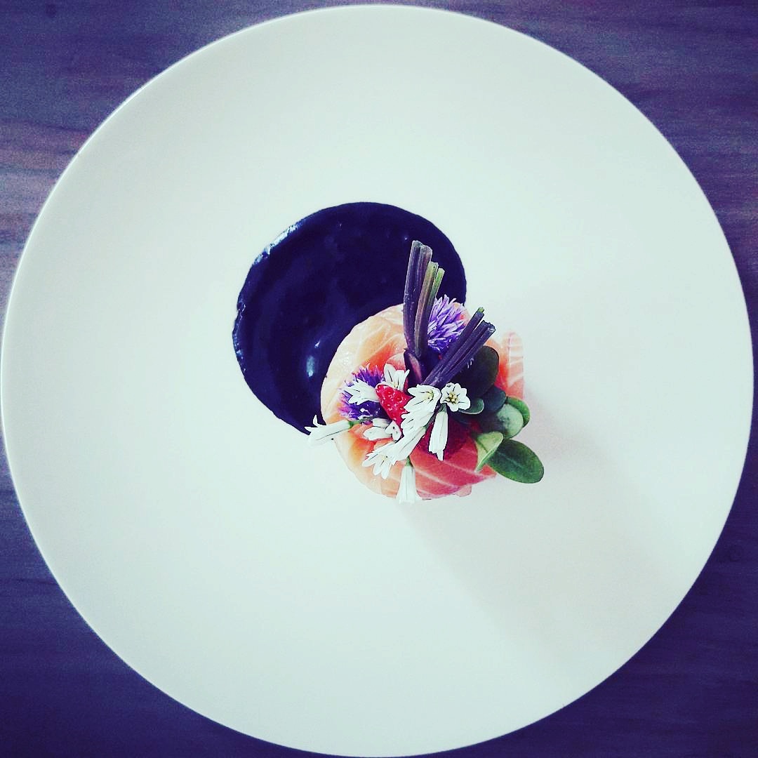 Assiette carpaccio de saumon, fleurs comestibles